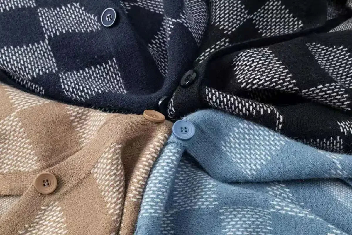 Stay ahead of the trend with this chic checkered cardigan, a must-have layering piece for every season. Its modern design and cozy texture make it your go-to for an effortlessly stylish look.